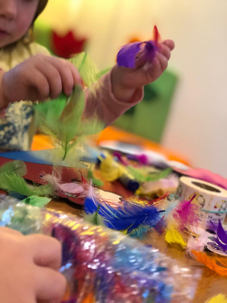 Wir spielen aber auch mit Naturmaterialen so werden wir z. B. Steine bemalen, mit gepflückten Gräsern, Moos und Ästen Teller bekleben oder einfach mit einem Eimer selbst gesammelte Kastanien experimentieren, perfekt zum Reingreifen oder Umfüllen. Auch ganz normale Alltagsgegenstände, wie Schüsseln, Löffel oder Tücher eröffnen völlig neue Spielwelten.